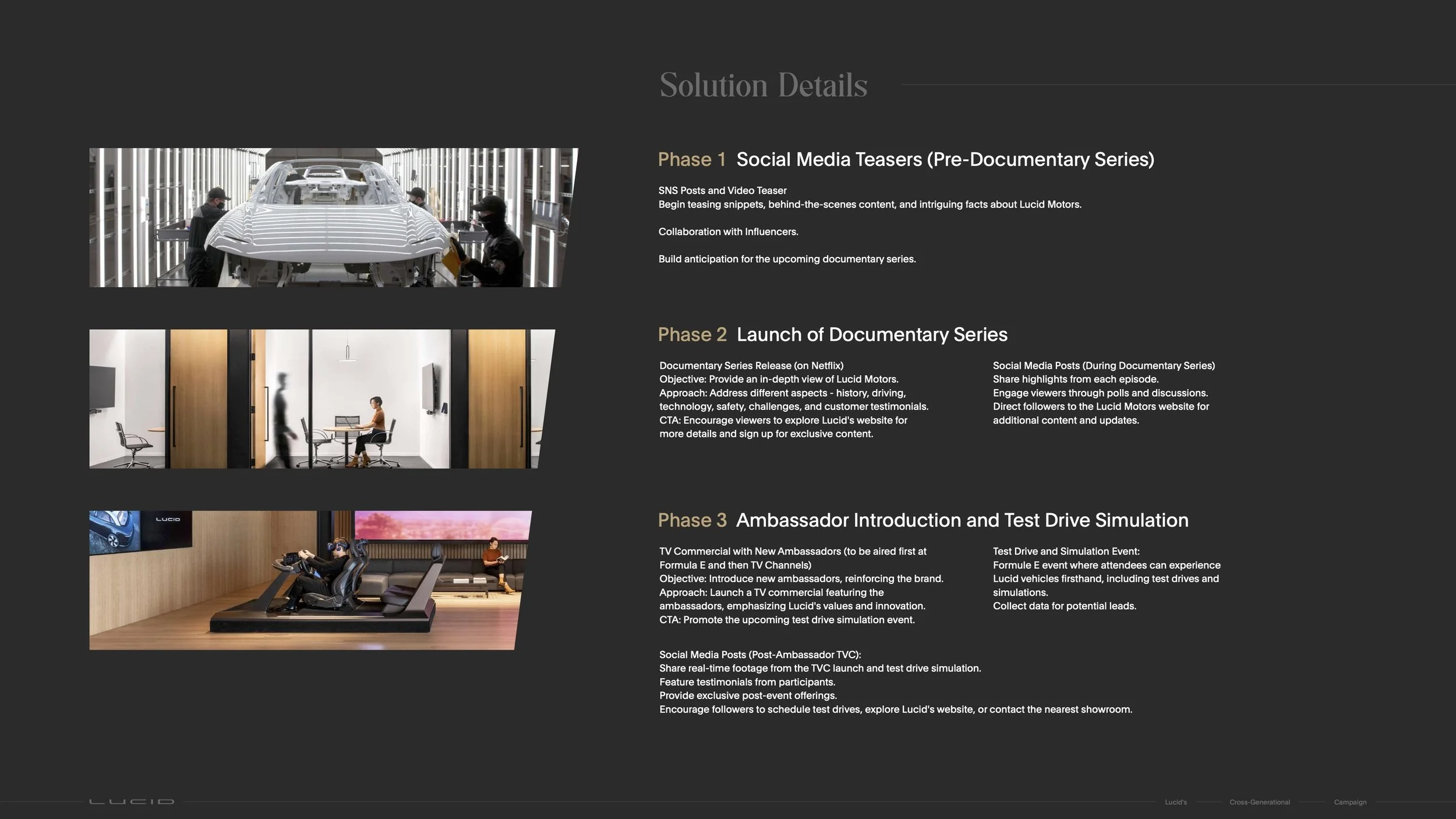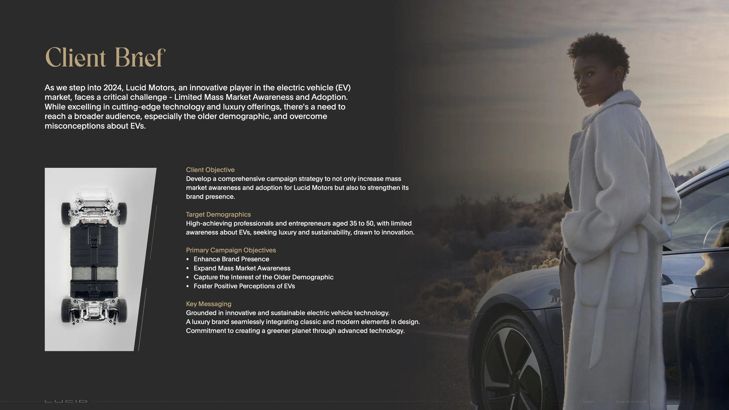 "Lucid's Cross-Generational Campaign: Transforming Perceptions, Inspiring Connections," is a dynamic campaign designed to transcend generational boundaries. As the campaign lead, my role involves overseeing the overall strategy, ensuring cohesion and effectiveness across all aspects of the campaign. Our aim is to reshape perceptions while fostering meaningful connections among diverse audiences.